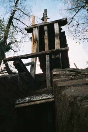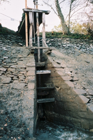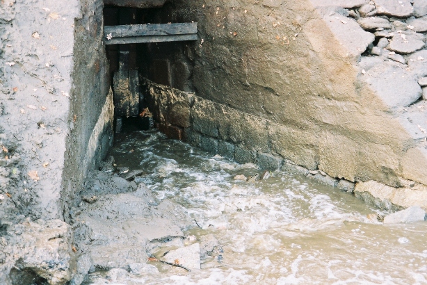Avant 2005, le conduit de vidange faisait environ 20 m et était fermé par la pelle en bois. Depuis il a été ralongé pour atteindre le moine de vidange. Il mesure environ 22m. Il est constitué en pierre sauf les 2 premiers mètres (environ) qui sont fait de pièces de bois sans doute d'origine.